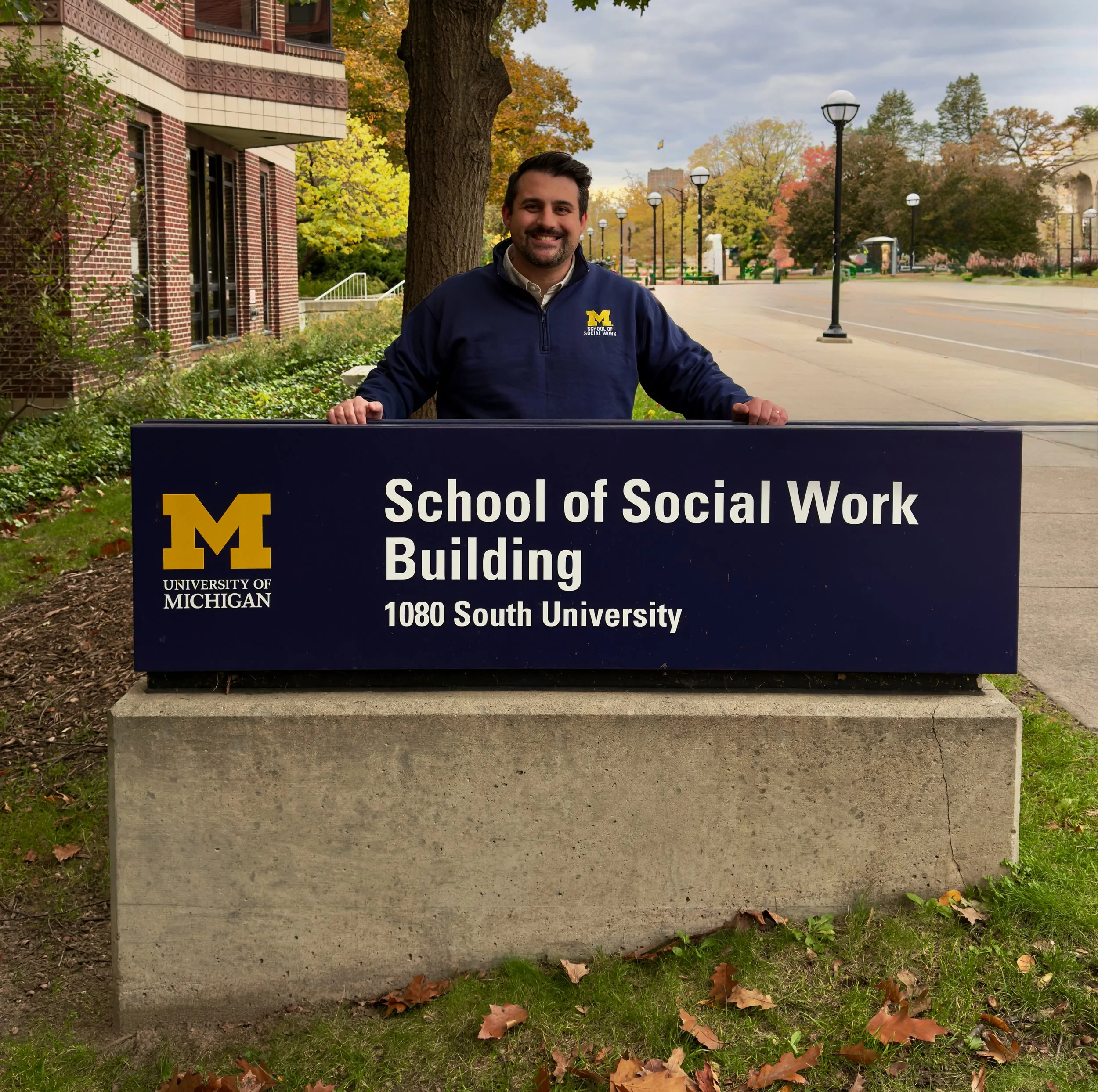 A man standing outdoors at Michigan University, smiling, holding a sign that reads 'School of Social Work Building, 1080 South University.' The sign features the university's logo and is placed on a concrete base. The background shows a sidewalk, trees with fall foliage, and campus buildings.